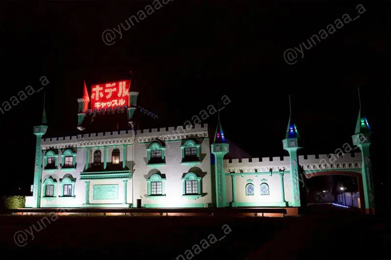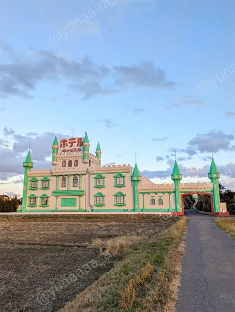 田んぼの中にポツンと現れるお城のラブホテル。まるでゲームや映画の世界観に迷い込んだかのようで、こんな場所が現実にあるなんて!と驚きを隠せません。白×エメラルドグリーンの配色もたまりませんね。通りがかりに写真を撮影していく人も多いのだとか。看板は旧ホテル名「キャッスル」のまま残っています。