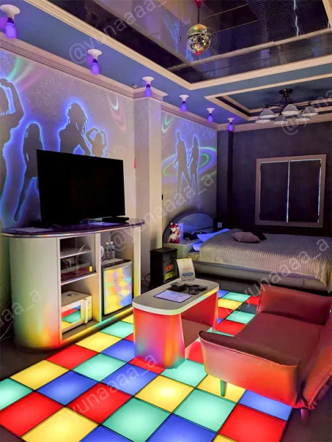 ディスコ部屋です。壁にはダンサーが光るブラックライト、天井には小さな鏡がたくさん貼られたミラーボールがありクルクルと回転。床に敷かれたライトタイルは時間差でゆっくり光ったり、パパッと点滅します。