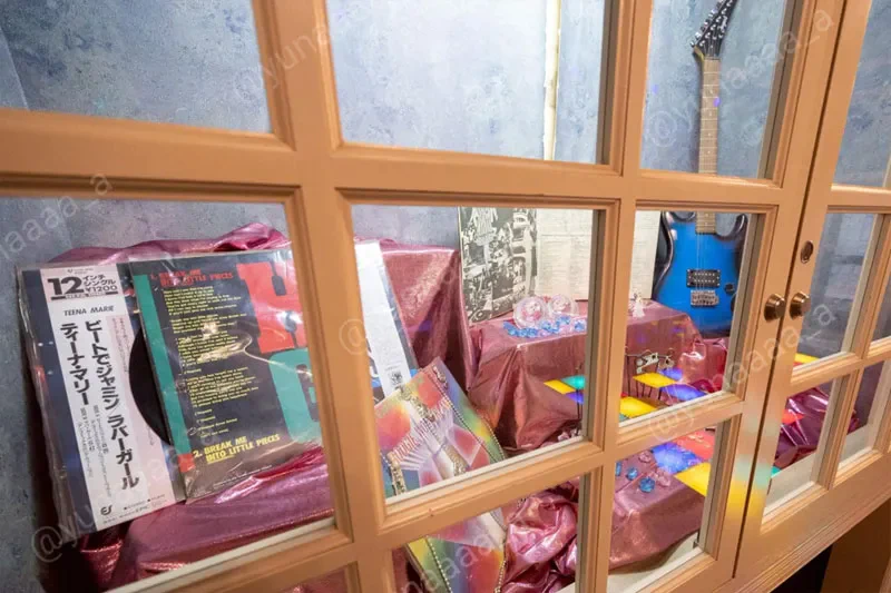 このようなディスプレイもあります。ディスコ部屋に合わせてギターやレコードなど音楽関係のものが飾られています。これらのディスプレイは定期的に変わるのでしょうか……。気になるところです。