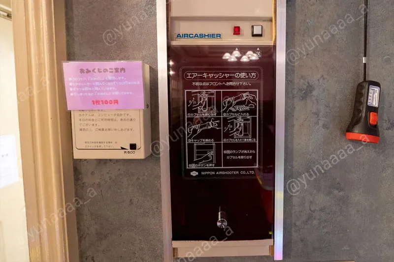 現在は自動精算機での会計で、残念ながらエアシューターでは会計できないのですが、まさかこんな風に再利用されていたなんて!おみくじのワクワクを味わえて、エアシューターの設備も楽しめるなんて、一石二鳥で発想が素晴らしいです。ぜひエアシューターが残っているラブホは、この「おみくじ」を採用していただきたいです。
