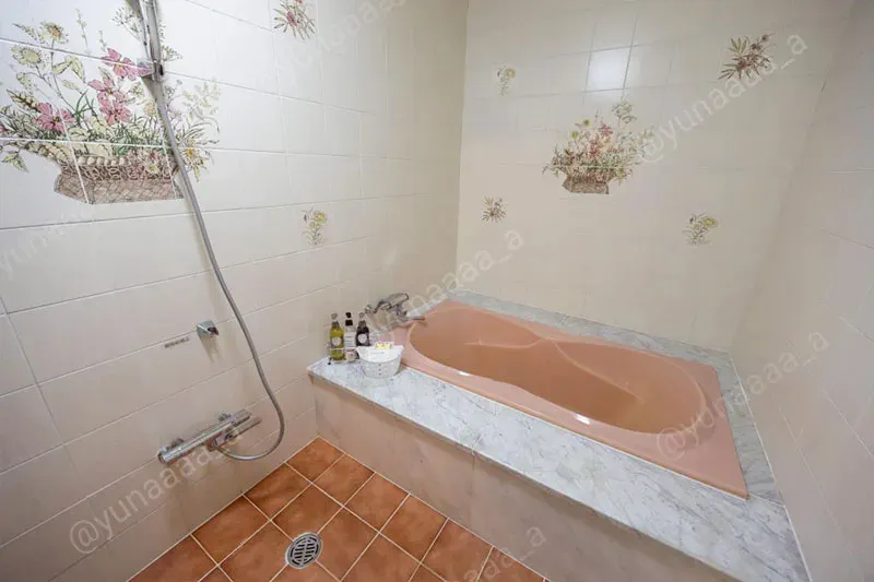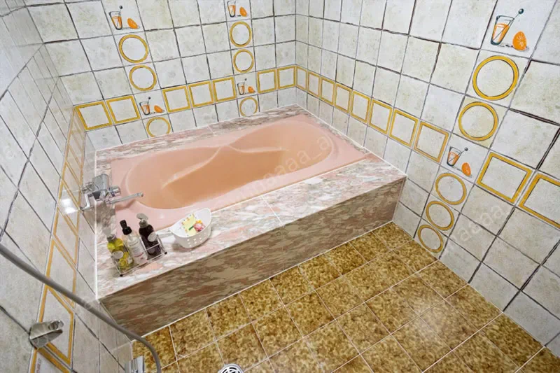 お風呂の広さは先ほどご紹介した部屋と変わりませんが、タイルのイラストが違いました。タイルのデザインに興味があるので、昭和ラブホの水回りはいつも注目して見ています。