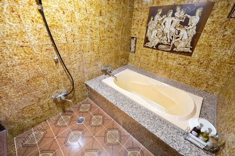 お風呂のタイルは茶色系でまとめられていて、壁には古代人が描かれています。