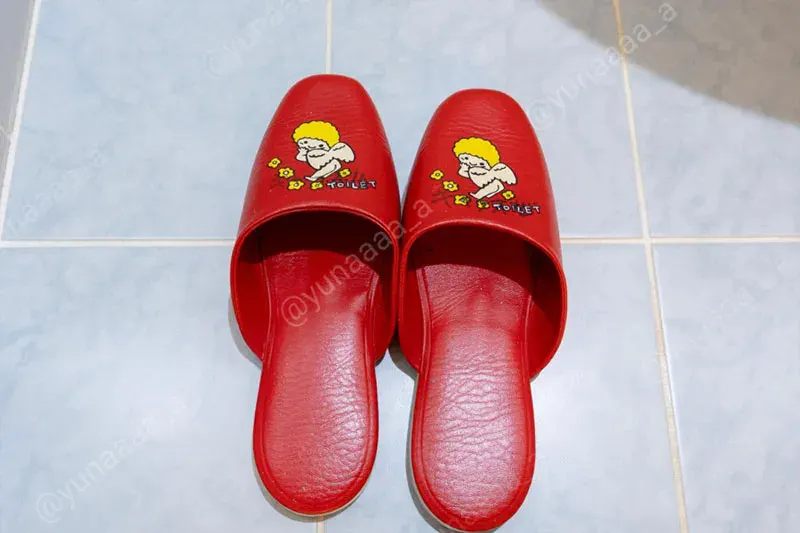 トイレに可愛いものを発見して顔がニヤけました。赤いスリッパに天使が!