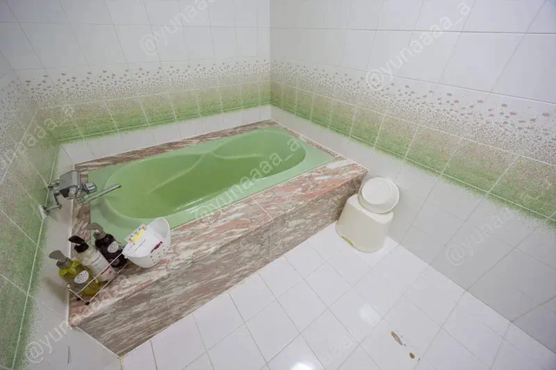 壁紙に緑が使われていましたが、それに合わせてなのかバスタブも緑です。家庭用のバスタブで緑はなかなか見かけない気が……。