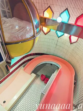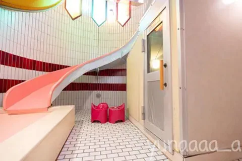 この部屋の一番の目玉はこちら!なんということでしょう。部屋に滑り台がついていて、ボタンを押すと水が出てくるのでウォータースライダーとして遊ぶことができます。