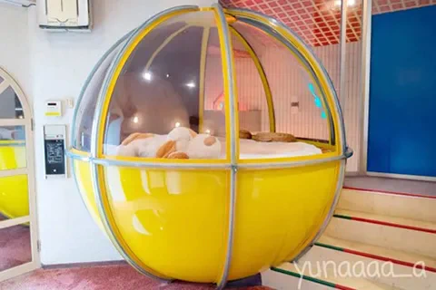どうやらカプセル型ベッドも当時、流行っていたようです。昭和ラブホが掲載されている写真集などで時々見かけることがありましたが、まさか実際にお目にかかれるとは……!これを見た時は感無量でした。カプセルに頭をぶつけないように要注意。ちゃんと二人で寝転がれるくらいのサイズ感になっています。