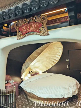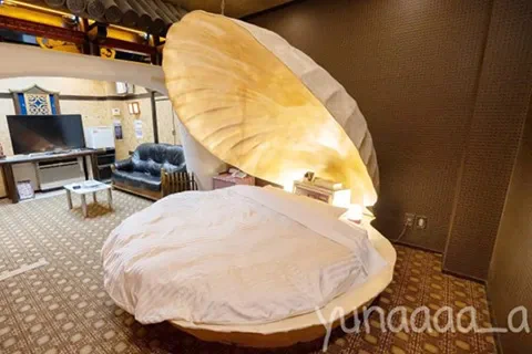 竜宮城を想像させられるような内装と貝殻ベッドが非常によくマッチしています。貝殻ベッドの写真をSNSに投稿すると「貝殻は閉じるんですか?」というご質問をいただくことがあるのですが、閉じません。閉じている姿も見てみたいような!