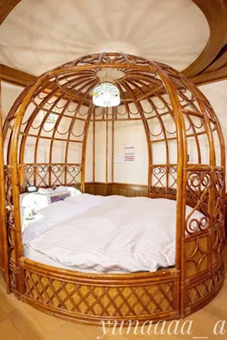 こちらは籐のベッドになっています。ここまで立派な籐のベッドは珍しくて、ベッドの天井に可愛らしい照明があるのもいいアクセントになっています。