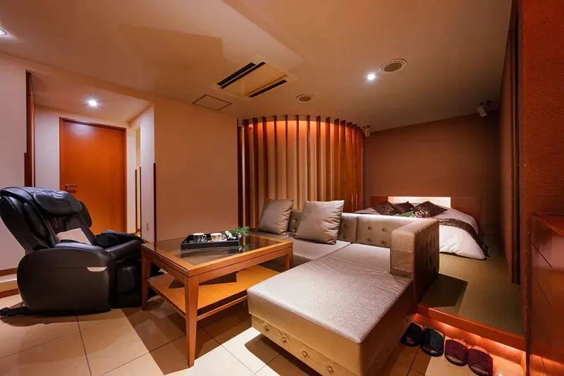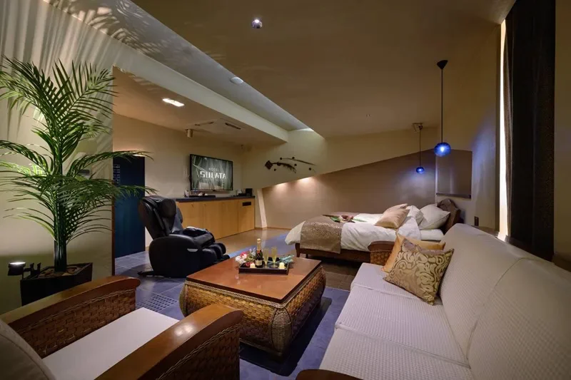 SULATA 帯広の女子会プランでは、全4室しかない最上位クラスの部屋が確約のものもあり、追加料金を支払えば最大6人まで利用することができます。女子会プランの客室には、ベッドの他にも大型ソファーやマッサージチェア、カラオケ機器が導入されており、露天風呂も導入されています♪