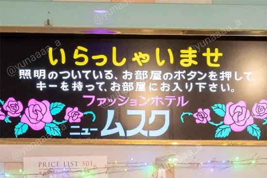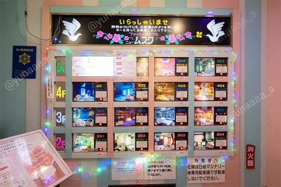 建物内に入ると客室パネルがあります。昭和ラブホ好きなら間違いなくワクワクするであろう部屋の数々に心躍らされます。パネルをよく見てみると「ファッションホテル ニュームスク」と記載されています。旧ホテル名を知ることができて嬉しい気持ちに。