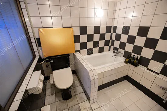 こちらの部屋はお風呂とトイレが同じ空間にあり、白×黒のタイルが印象的です。