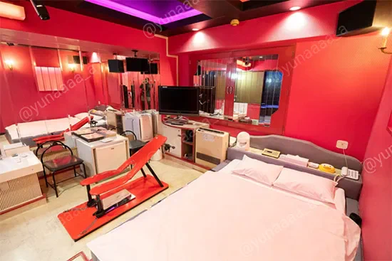 部屋の壁紙は、赤に近いような濃いピンク色になっていて、SMの雰囲気が漂っています。