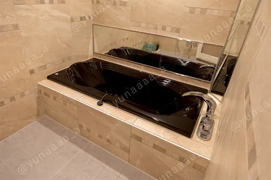 浴室は、主に壁や床がリニューアルされている様子です。バスタブ横の鏡も良いアクセントになっていますね。黒いバスタブがスタイリッシュです。