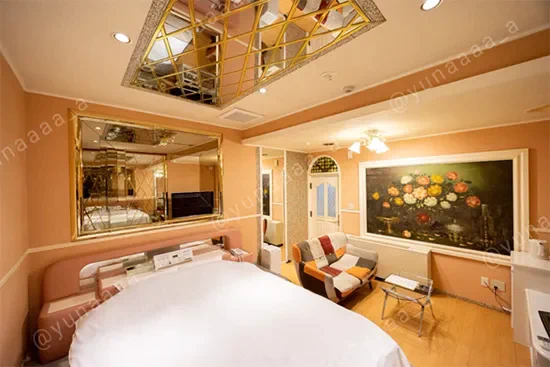 こちらは壁だけでなく天井にも鏡があります。壁の花の絵も部屋によく馴染んでいて、高級感を際立たせています。
