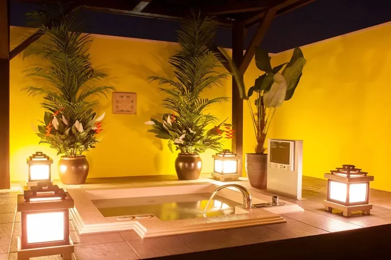 岩盤浴や檜風呂、七色に光る浴槽HOTARUと、お風呂が充実しているのもこのホテルの特長です。とくにおすすめは、ブラックライトアートが施された浴室(210、310、410、510、610)。ライトをつけると浮かぶ上がる幻想的な光景は必見です。