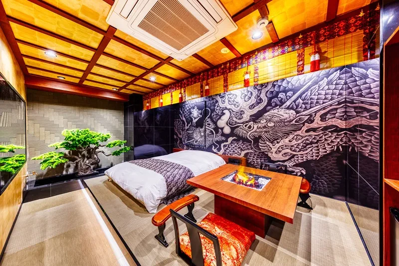 入り口から既に、日本をイメージした鮮やかな世界観を感じられます。お部屋は花魁、侍、殿さまなど和を基調とした様々なデザインルームが用意されています。高級旅館のような客室露天風呂や室内庭園、金魚水槽などの贅を尽くした設備は圧巻です。大阪ならではのビリケンさまがいるお部屋もございます。