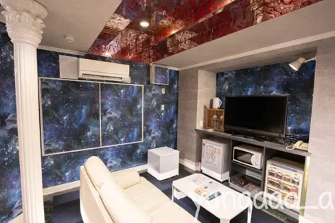 ソファルームはこちら。鏡張りかと思いきや……宇宙柄の壁紙になっています。