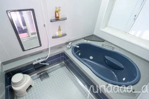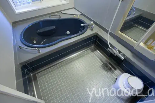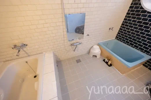 お風呂場も清潔感があり、青いバスタブが印象的です。2人で入るにはちょうどいいサイズ感になっています。昔はサウナが使用できたそうなのですが、修理できる業者がなくなってしまい、残念ながら今は使われていません。