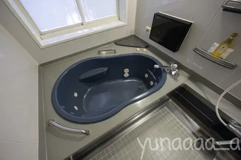 浴室は先に紹介した111号室と同じデザインになっていて、バスタブの形が可愛らしいです。テレビも付いているので、ついつい長風呂になってしまいそうです。