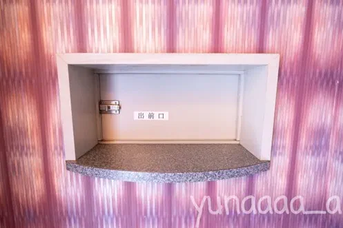 玄関横では出前口を発見。出前を頼んだ時にここから受け取りができます。壁紙の柄は「いかにも昭和ラブホ」という雰囲気が漂っていて、これまた素敵です。