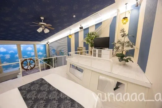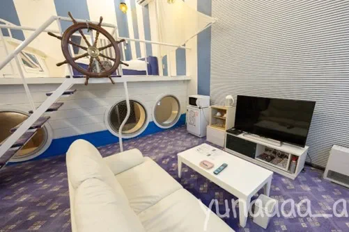 なんだか、遊園地の船のアトラクションを思い出しました。他の部屋と比べて部屋のつくりも広めになっているので、開放的な気分を味わい時にも良いかもしれません。