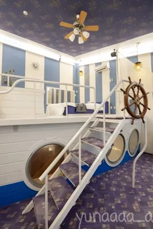 なんと、船の部屋になっています!しかも階段が付いていて、船の上にベッドルームがあります。これまでに、船の形をしたベッドは何度か見たことがあるのですが、このようなタイプとは初めて出会いました。