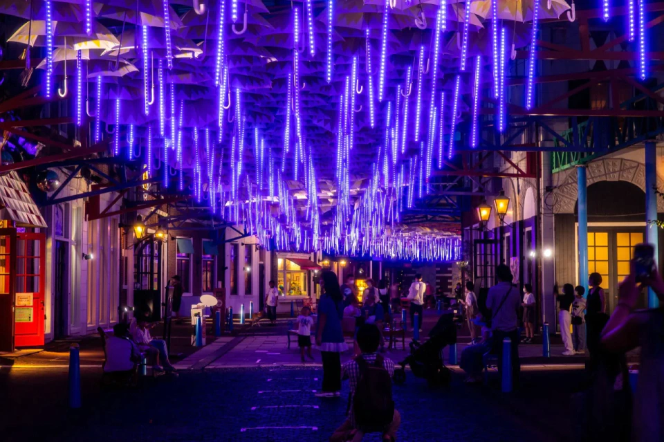 映えスポットとしても人気な「アンブレラストリート」。約700本の傘とスティック状のライトが訪れる人達を魅了します。