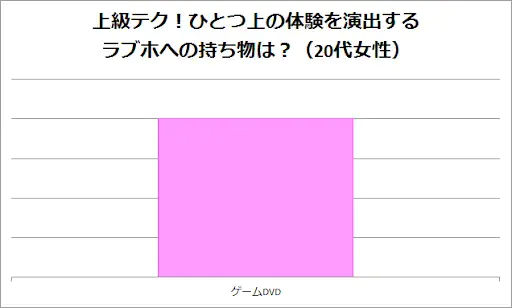 20代女性にアンケートをしたところ、唯一出てきたのがゲーム・DVDとのこと。 特になにか持ち込まずとも楽しめるのは若さゆえでしょうか。 ゲームやDVDは家のテレビよりラブホのテレビのほうが大きければ大画面で楽しめますし、ゆっくり見れるので、いいかもしれませんね。