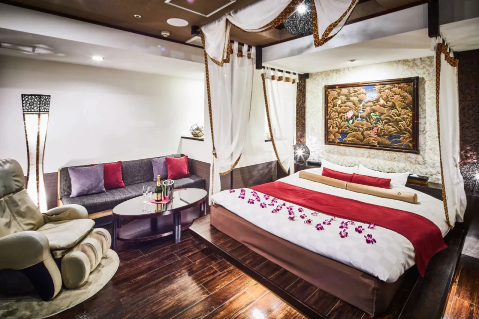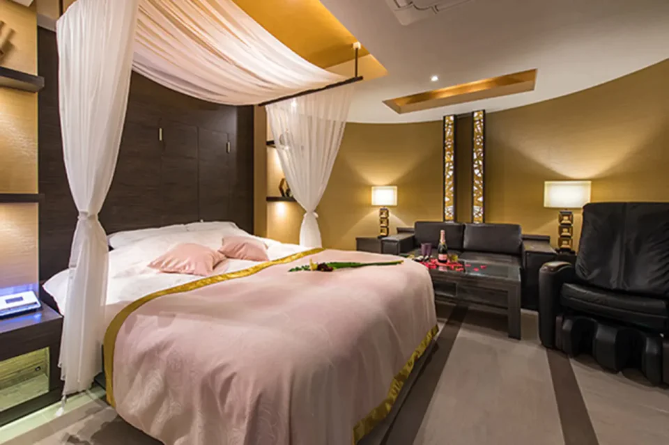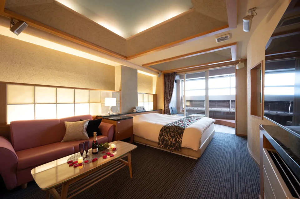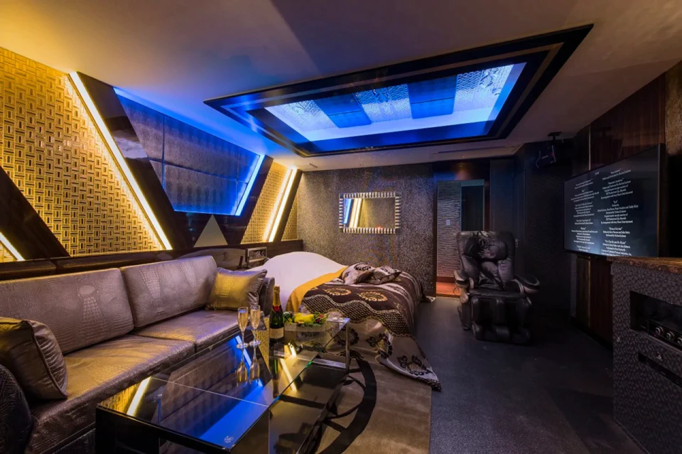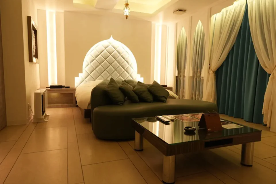 お城のような外観が特徴の「HOTEL MYTH L」は、一歩足を踏み入れれば、息をのむほど美しいお部屋のデザインに圧倒されます。どのお部屋も照明の色合いやインテリアの細部までこだわり抜かれ、幻想的なリゾート空間を演出しています。