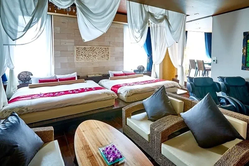 大人気お姫様ベッド(天蓋)&女優ミラー全室完備!癒しの大人気無料施設。「岩盤浴ルーム」「脱毛エステルーム」どちらも貸切のプライベート空間。2024年5月にリフレッシュして生まれ変わったバリの雰囲気をお楽しみください!