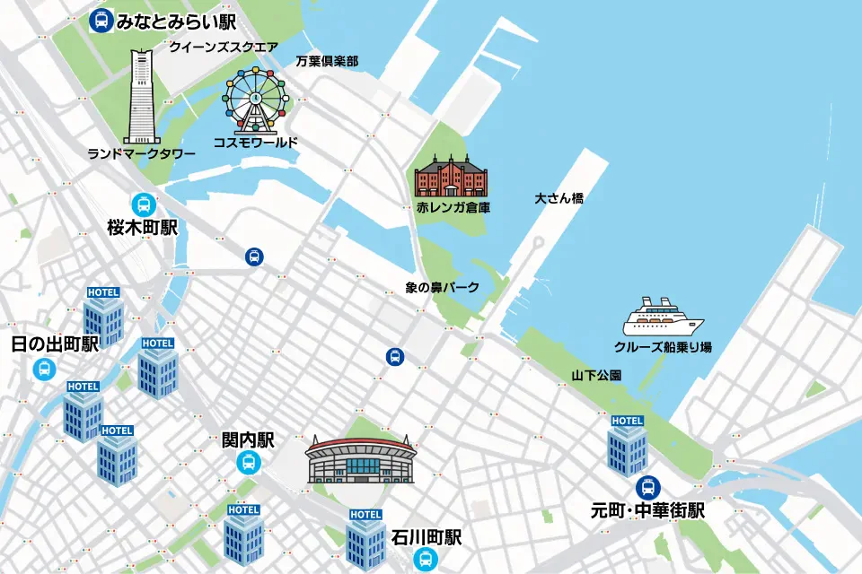 JR「桜木町駅」やみなとみらい線「みなとみらい駅」「馬車道駅」から徒歩圏内です。どちらの駅も観光スポットに近く、移動が簡単です。中華街を利用の際は、みなとみらい線の元町・中華街駅を利用しましょう。