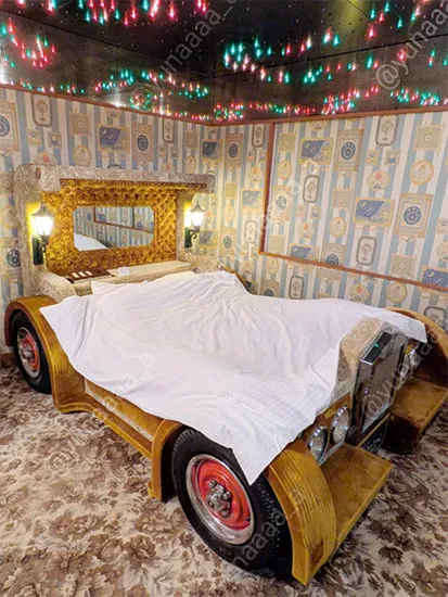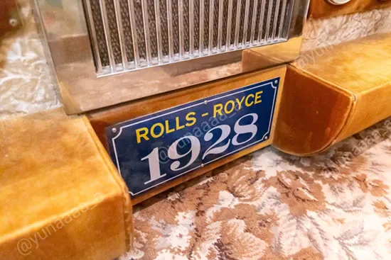 あの高級車「ロールスロイス」のベッドがお出迎え!しかもタイヤはプラスチックなどではなくゴム製で本格的。正面にはナンバープレートまであり、昭和の本気がバシバシと伝わってきます。