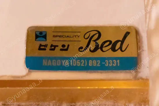 ちなみにこのベッドは、当時数々のベッドを製造していた「ビケンズベッド」というベッドメーカーが製作したベッドです。その証拠として枕元には「ビケン」のプレートが。昭和ラブホでこのプレートと出会えると、いつもテンションが上がります。