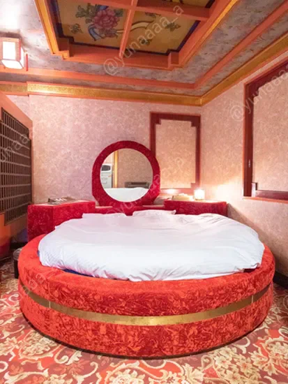 赤い円形ベッド、枕元には円形の鏡。たまらない組み合わせです。