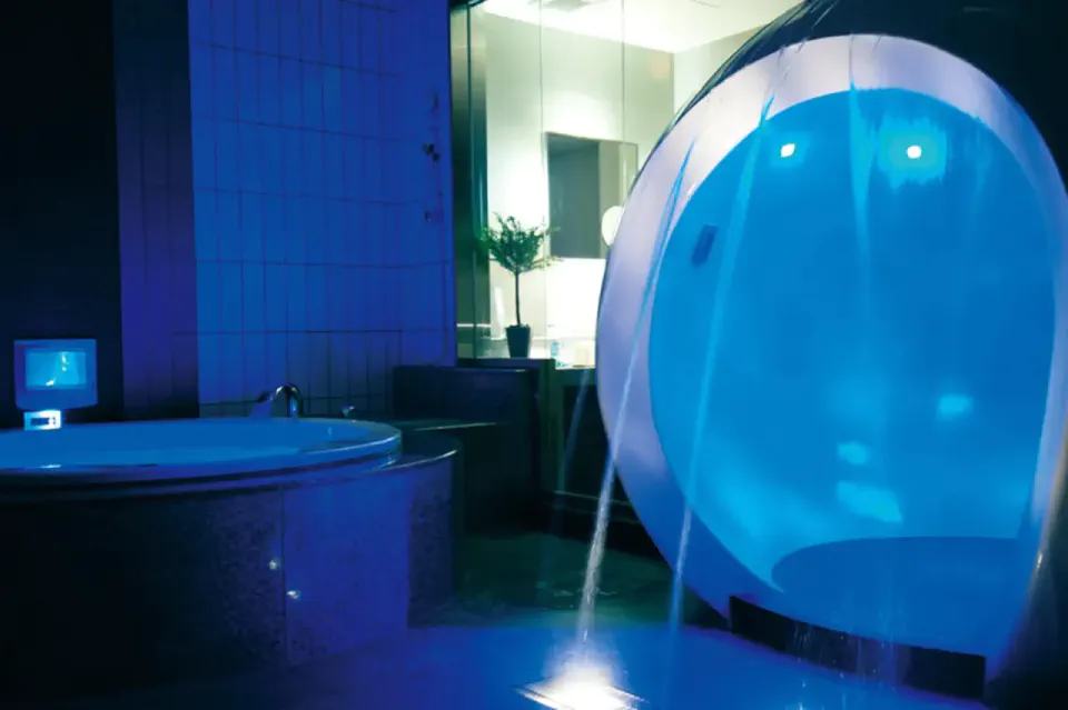 水をイメージし建てられて、ロビーには滝が流れ落ちています。夜間は水面の揺らぎを映す照明、共有スペース、客室内まで静かにBGMを流し癒しの空間が創出されています。