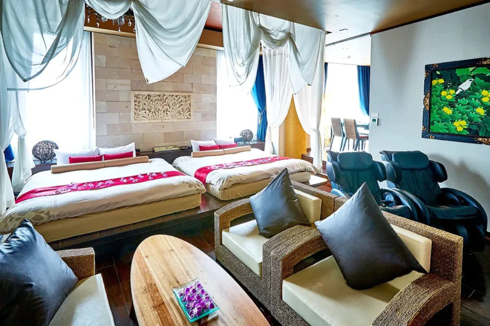 お部屋はバリをモデルにした、全室天蓋ベッド付きのお部屋になっています。お部屋限定で、露天風呂やミストサウナ、人工温泉などの設備があり、極上のリゾート気分を堪能できます。