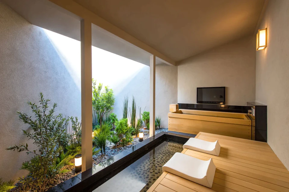 様々なランクのお部屋がある中おすすめしたいのは、「フォーシーズンズスイート1・2」「スイート1・2」のランクです。どちらも海外のリゾートホテルのようなお部屋のデザインと、露天風呂やスチームサウナなどのリラクゼーション設備、外気浴ができるおしゃれなテラスなどが魅力です。