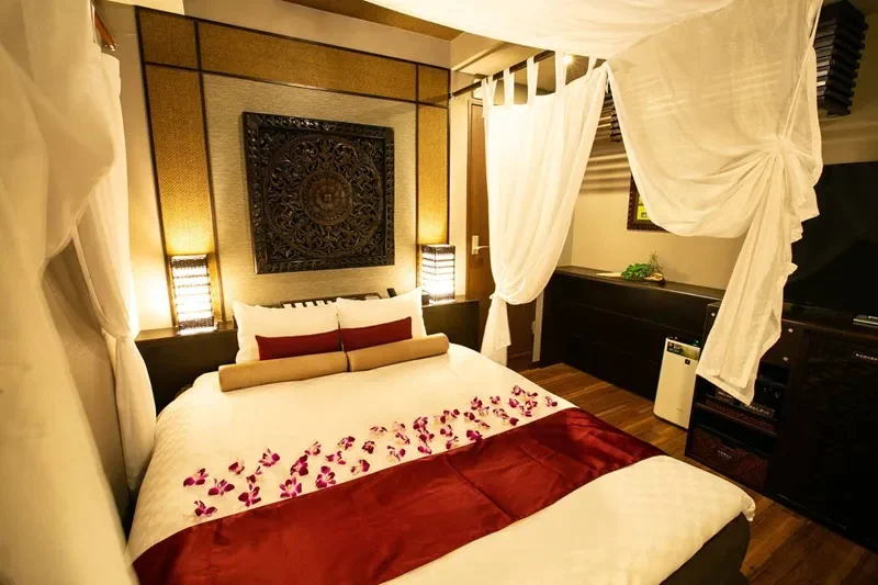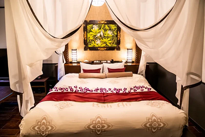 入口からバリリゾートの雰囲気が感じられ、一歩足を踏み入れると五感でリゾートを感じられます。フロントにはアメニティバイキングが用意されており、入浴剤も好きに選べます。デザートも用意されているので、お部屋に入室する前にも楽しみがいっぱいですね。もちろんお部屋もバリリゾート感満載で、家具や内装にもこだわりを見ることができます。天蓋ベッドはもちろんのこと、ベッドの質も良くふかふかで非常に快適だと評判が高いです。