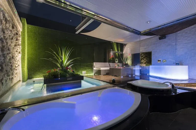 内装はクラシックモダンやアジアン、和室をテーマにしており、サウナや岩盤浴をはじめとしたスパ要素を取り入れています。VIPルームには露天風呂やプライベートガーデンも設置されており、まるで映画に出てくるセレブのような体験ができます。