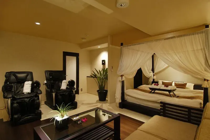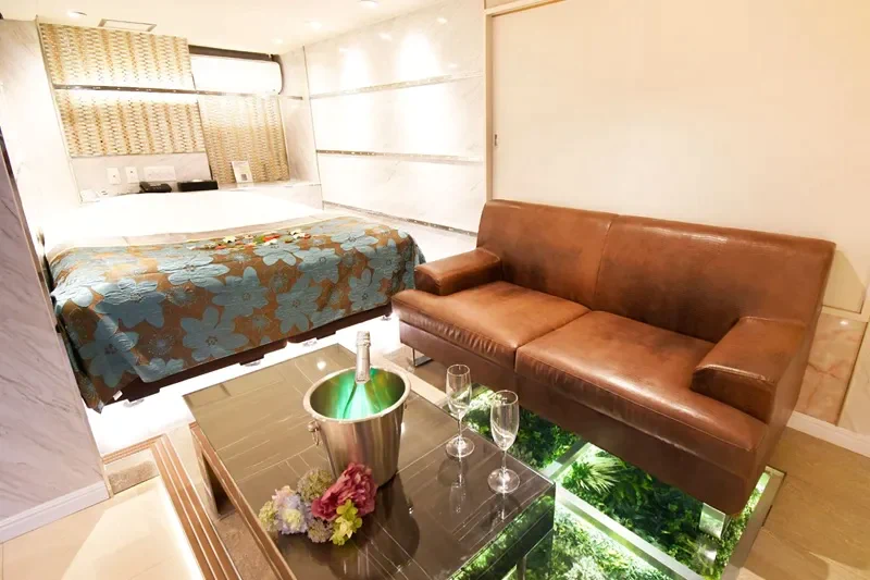 館内に漂う心地よいアロマの香りが、訪れるゲストの緊張を優しく解きほぐす設計。 ラグジュアリーな内装と間接照明が織りなす、ロマンチックなムードが漂う客室。 充実したバスアメニティを備え、至福のバスタイムをふたりで堪能できます。 周囲の目を気にせず、プライベートな時間を存分に満喫できる環境。