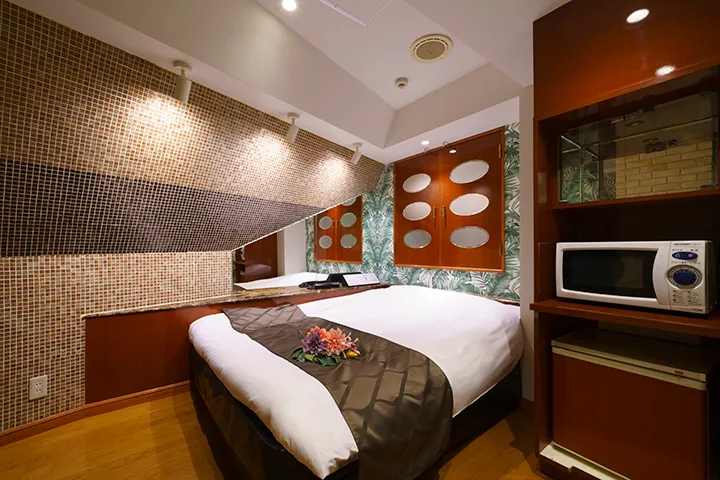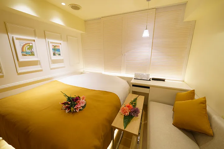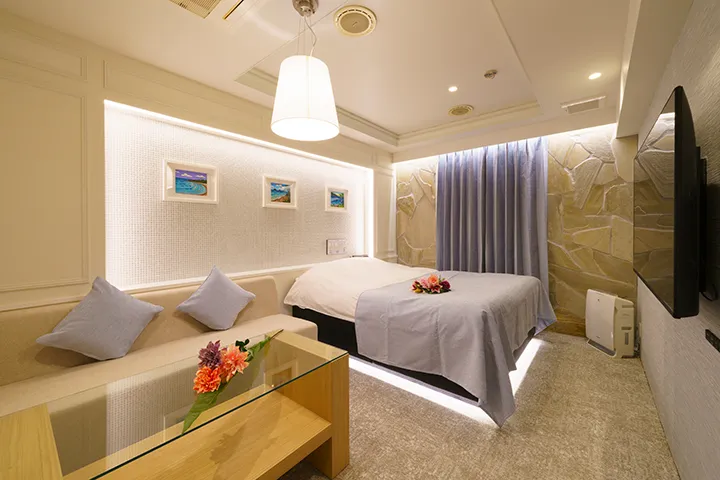 この度リニューアルしたホテル名は、ハワイの言葉から。「楽園の花」――つまり、幻想的なほどに美しい花を意味する。南国の陽光を感じさせる明るさと、洗練された美しさが調和する、ハワイアンデザインの部屋は「306」「307」「102」「407」など全9部屋。中でも「503」はまるで海外にいるかのような雰囲気だ。柔らかな白が映える広々とした空間は、バスルームも同様。ブロアバスに身を委ね、浴室シアターで好きな動画を見ながら、存分に寛ぎたい。