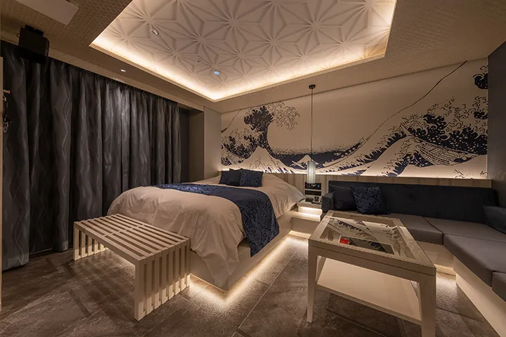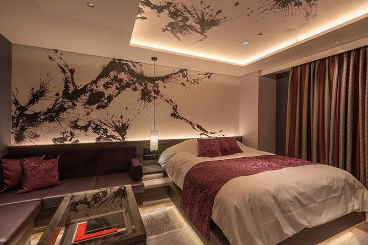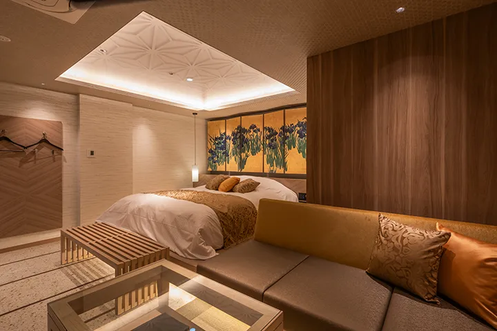 ホテルの外観は、まばゆいばかりの光であふれている。輝く滝のように美しい佇まいは、高級旅館そのもの。館内は洗練され、全35室どの部屋を選んでも、和の趣にあふれたワンランク上の時間を過ごせるだろう。例えば金屏風を思わせる内装が目を引く「203」や、シンプルながらも華やかさが際立つ「402」。和の伝統美に包まれた空間が、2人の時間にふさわしい彩りを添えてくれる。