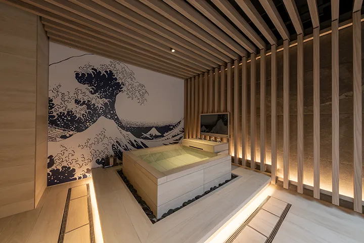 また兆スウィートの「405」「406」も人気の部屋だ。フカフカのベッドに加えて、半露天風呂がついた開放感のある浴室は見逃せない。木の温もりに包まれた浴槽に2人で浸かれば、心までほぐれる癒しのひとときが流れていく。 さらに、「302」「407」など4部屋限定で備わるプライベートサウナでは、誰にも邪魔されない“ととのい”のひとときを。岩盤浴付きルームでは、じんわりとした温熱が芯から体をほぐし、深いリラクゼーションを堪能できる。