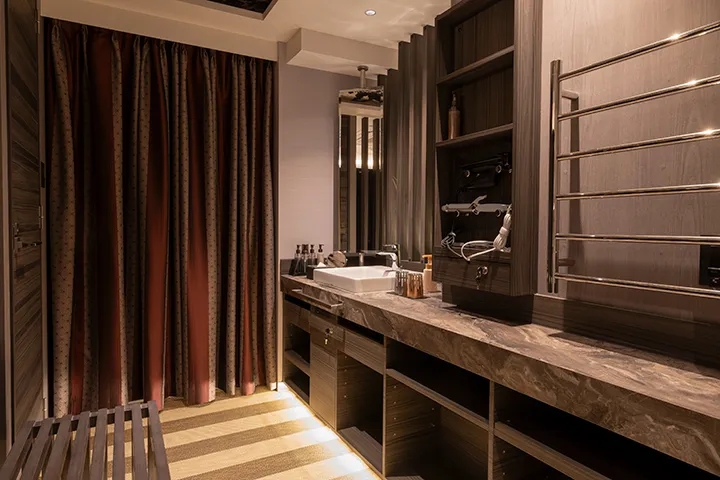 パウダースペースなどの細部にもこだわりが。広々とした空間に設けられた2ボウルの洗面台は、2人並んでもゆったり使える心地良さが嬉しい。ヘアドライヤーなどをすべて「ReFa」製品で揃えた部屋もある。