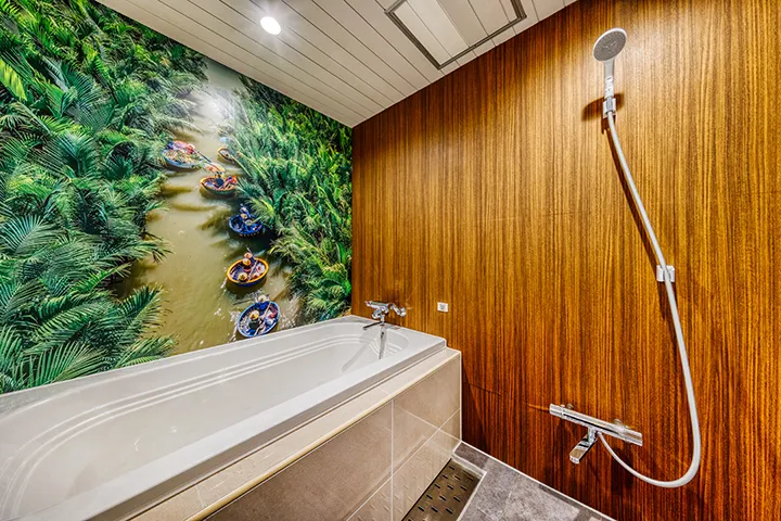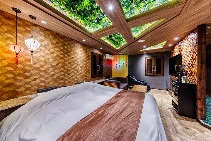 『EAST』は、ベトナムのダナンリゾートをイメージした空間だ。ラタン調の家具やランタンが海辺の風を想起させ、異国の浜辺に身を置いたような気分に。広めの客室「201」「301」などには本格的なカラオケ設備があり、リラックスを誘うマッサージチェアも完備されている。また、「202」のハンモックに揺られるのも楽しい。遊び心に満ちた内装は、何度訪れても新鮮な驚きがある。
