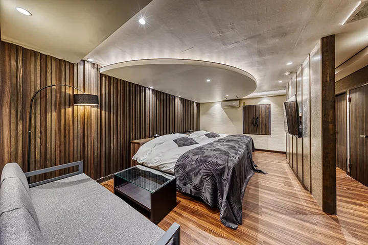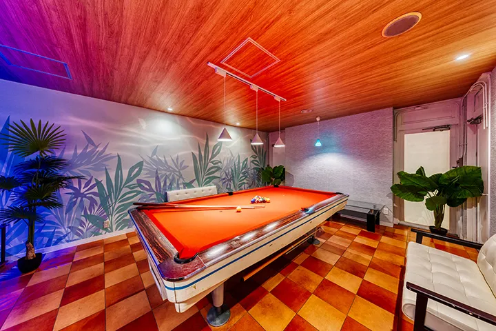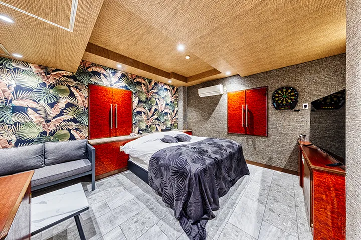 『WEST』のテーマはハワイアン。白やブラウンを基調とした内装が清潔感と開放感を演出し、どこか穏やかな南の島を思わせる空間に仕上がっている。中でも人気の部屋はツインベッド仕様の「509」。広々としたベッドに寝転んで、備え付けのプラネタリウムをつければ、天井に映し出される幻想的な映像に目を奪われることだろう。恋人とはもちろん、友人同士で宇宙に思いを馳せるのも一興だ。「605」にはダーツ、「501」「601」にはカラオケを完備。1階には貸切で使えるビリヤードルームもあり、宿泊のひとときに遊び心を添えてくれる。
