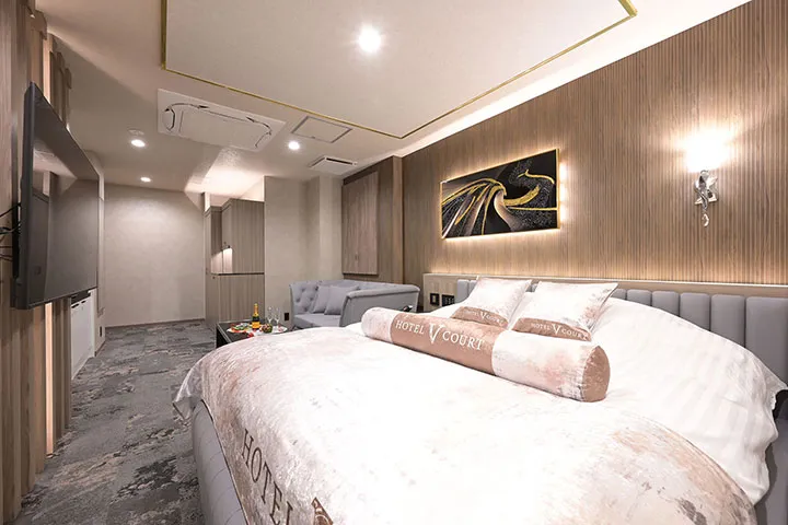 全25室の客室は、白やグレーを基調にした落ち着きのある空間。無駄のないシンプルなデザインが、上質さを際立たせている。身体をふんわりと包み込む大きなベッド、深く腰を預けられるソファーなど、すべてが“くつろぎ”のために厳選されたものだ。また充実した設備にも注目したい。バスルームがゆったりとした造りなのは言うまでもない。さらに「201」「202」「305」など6部屋は、2人で入ってもゆとりのある広さのドライサウナも完備している。これほど多くのサウナ付き客室を備えたレジャーホテルは、市内でもトップクラスと言えるだろう。