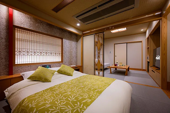 もっと贅沢を味わいたいときには、25号室を選びたい。鳥や植物が描かれた繊細な壁紙に、青を基調としたニュアンスカラー。どこかフランスのアパルトマンを彷彿とさせる空間は、素朴さと高級感が絶妙に調和し、心をほどく寛ぎをもたらしてくれる。ほかにも開放感のある浴室が魅力の部屋や、和の落ち着きを感じる和室など、多彩な表情が楽しめる。