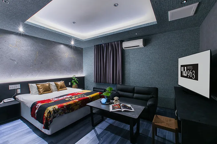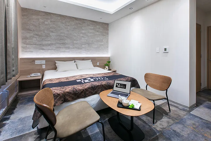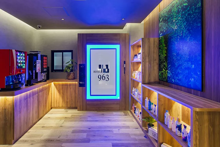 木目調の外壁に温かな光が映える、スタイリッシュな佇まいの『ホテル963【SLP HOTELS GROUP】』。御井駅から車で5分という好立地に建つ、女性目線の工夫を随所に取り入れたホテルだ。カップルでの利用はもちろん、ビジネスでの滞在にもフィットする雰囲気とサービスは、ゲストに好評を得ている。