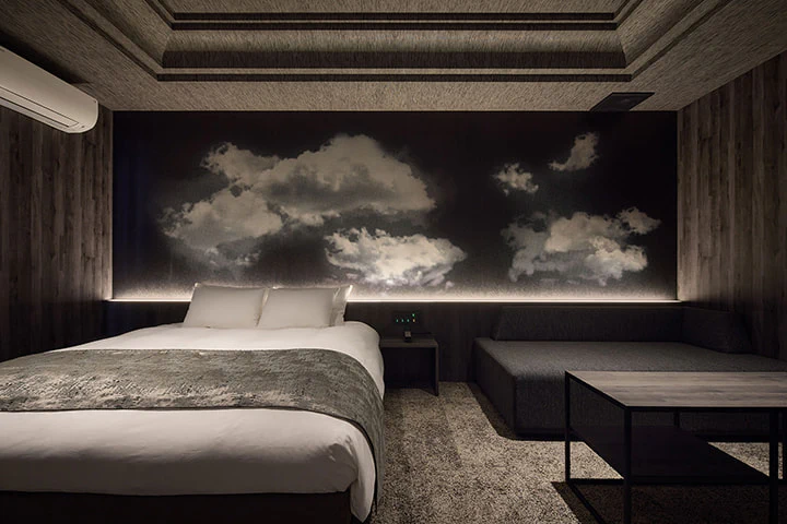 一方、月の美しさを映す「212」は幻想的な空間。壁に描かれた雲は、ただ眺めるだけでは終わらない。スマートフォンのカメラを向けると、ふわりと浮かび上がる仕掛けが施されており、サプライズ的なときめきを添えてくれる。静かに、そしてさりげなく、非日常を演出する部屋だ。